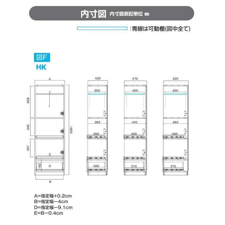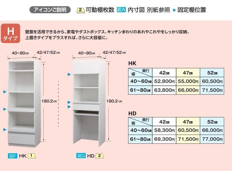 ●HKレンジすきまくんは幅40〜80cm1cm対応! 奥行42/47/52cmの3タイプ高さは180.2cm固定になります。※別売の上置きUシリーズで天井までタップリ収納もできます。